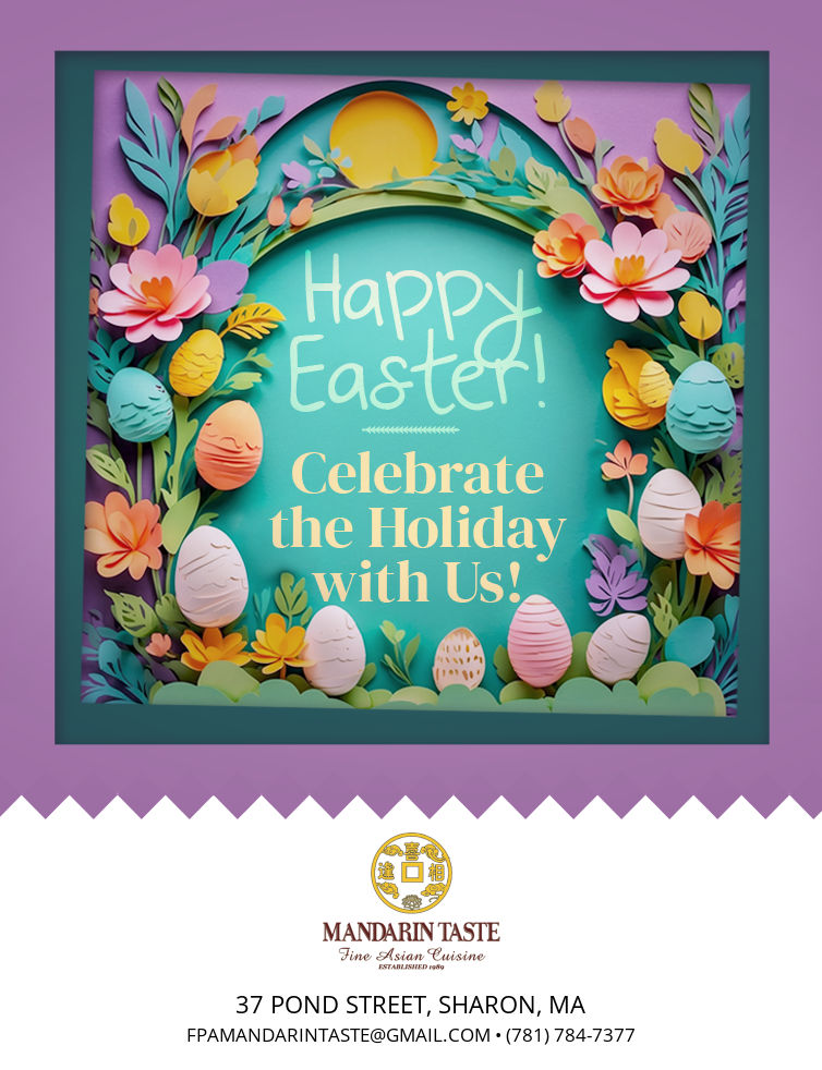 💘 Mandarin Taste EASTER Special PROMOTION Celebrate EASTER with delicious Chinese flavors! Spend $75+ → Enjoy 10% OFF your order 📍 37 Pond St, Sharon, MA 02067